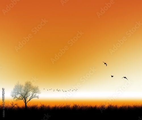 Tranquil Sunset Landscape with Silhouette of Tree and Flock of Birds