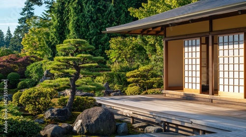 Tranquil Tea House Surrounded by Lush Rock Garden and Bonsai Trees