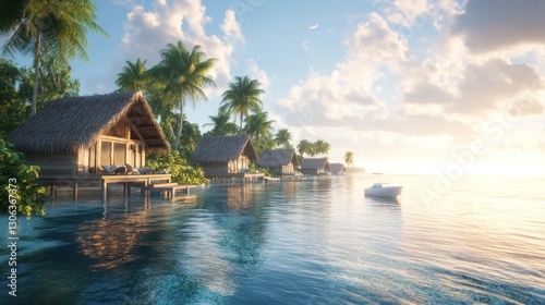Tranquil Tropical Getaway: Luxurious Overwater Bungalows at Sunset