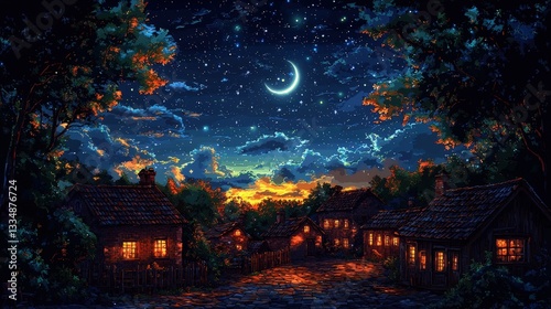 Tranquil Village Night Scene with Moon and Stars Illuminating the Cozy Homes in a Serene Landscape