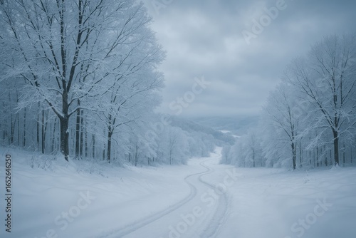 Tranquil winter scenery showcasing a snow-lined pathway meandering among dormant trees and rolling terrain under overcast, cold weather.