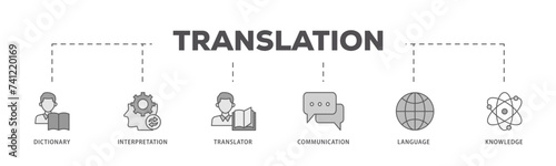 Translation icons process flow web banner illustration of dictionary, interpretation, translator, communication, language, and knowledge icon live stroke and easy to edit