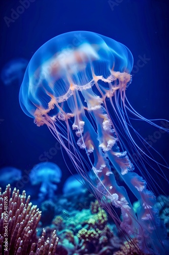Translucent Jellyfish with Pink Tentacles Floating Gracefully Over Colorful Coral Reef