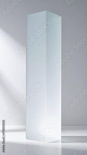 Translucent Rectangular Glass Block Sculpture against Soft Gray Background with Light Beam