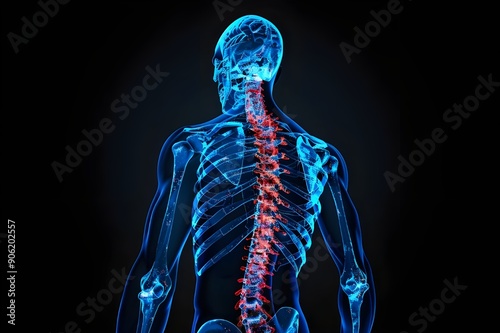 transparent blue human body showing bones and abnormal C-Shaped spine with red