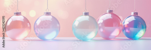 Transparent iridescent Christmas decorative balls, subtle synthwave colors. Trendy Christmas backdrop. Generative AI.