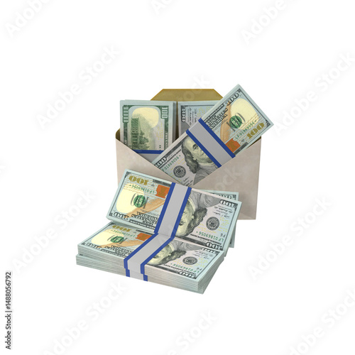 Transparent PNG 3D render of envelop 100 dollar banknotes with realistic textures and lighting. Isolated on alpha background, ideal for finance, design, marketing, and visual presentations.