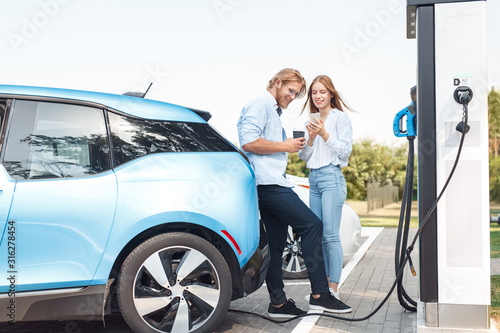 Transportation. Young couple traveling by car having stop at charging station boyfriend drinking coffee talkingn with girlfriend browsing smartphone joyful while waiting vehicle to charge