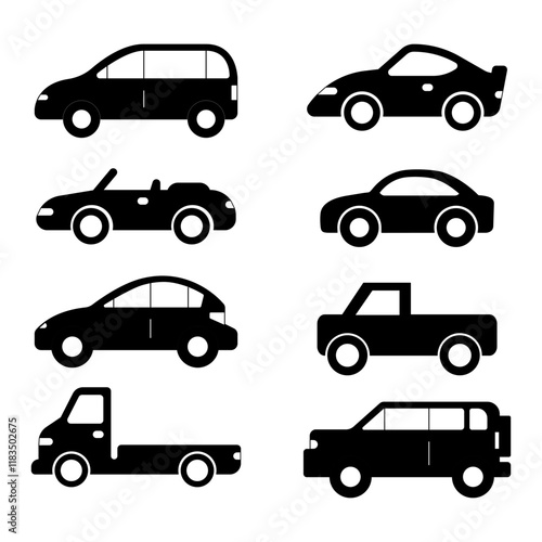 Transporttation vehicles automobile traffic of trasport car van truck black siluete side view pictograms icons set colletions vector flat design white background