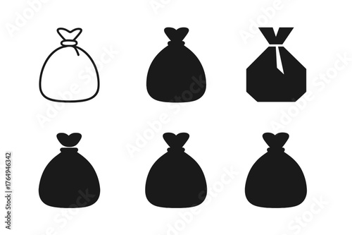 Trash Bag Logos. Taking Out the Trash. Set Logo of Trash Bag: Minimal outline, Filled silhouette, Abstract geometric, Negative space, Flat solid, Symmetrical