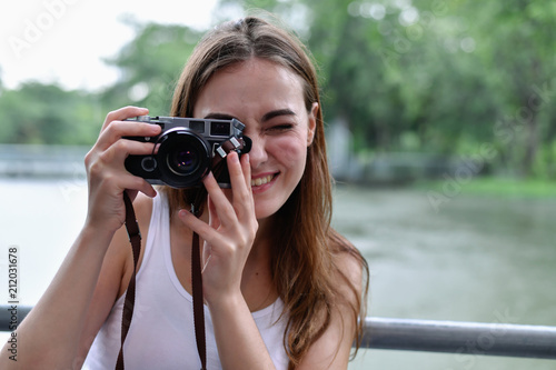 Travel concept. beautiful girls are traveling in the woods. Beautiful women are taking photos in the forest.