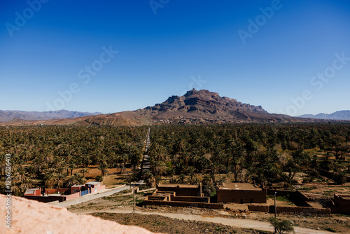 Travel destination Morocco, palm tree grove and mountain area, amazing oasis.