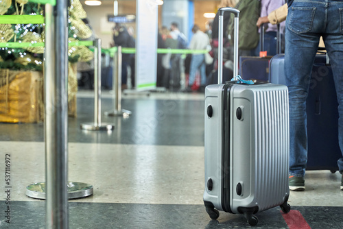 Travel in Christmas concept. Suitcase at airport line with Crhristmas tree in background