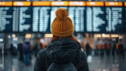 Traveler in Yellow Beanie Observing Flight Information Board at Modern Airport Terminal