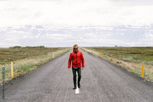 Traveling man wearing warm clothes walking along empty asphalt roadway and enjoying scenery of mountains covered with snow in Iceland