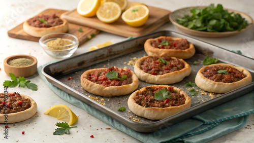 Tray of Freshly Baked Sfiha in a Middle Eastern Street-Food Setting