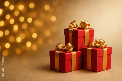 Tre pacchi regalo rossi con fiocchi dorati su sfondo dorato. Generative AI