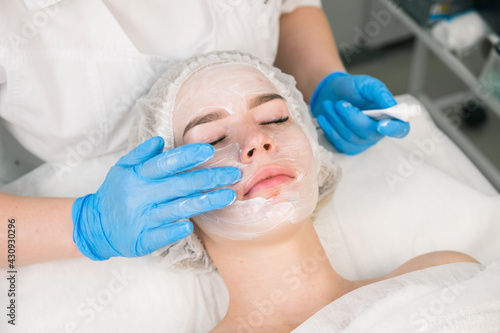 Treatment, cure of face skin in cosmetology clinic. Beauty procedure with problem skin for young woman. Cosmetologist doctor is applying cream with anesthesia before PRP therapy procedure.