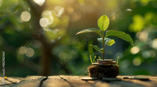 Tree growing on stacked gold coins on wooden table with green nature background, business growth concept.