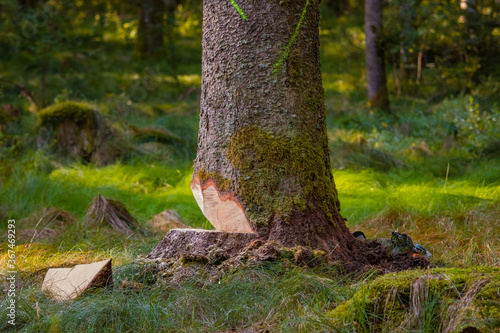 Tree prepared to cut. Partially felled tree in the forest. Environment, deforestation concept