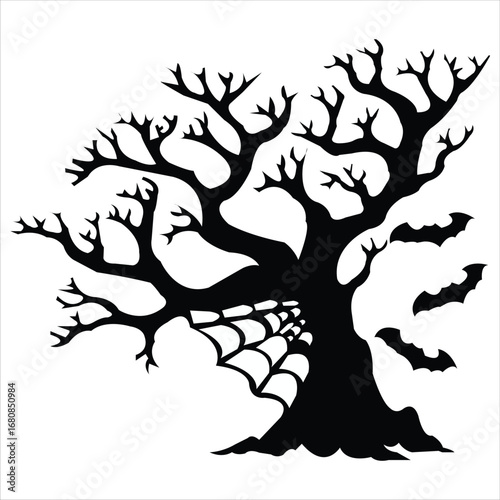 tree silhouette with roots, scary tree, bats