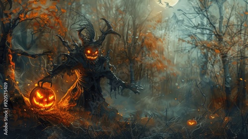 tree witch with glowing pumpkin in forest