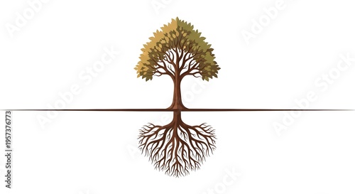 Tree with detailed roots and green leaves symbolizing growth, nature, and a strong foundation.