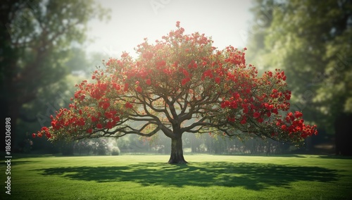 Tree with red roses as a floral background for wallpaper, decorative natural scene
