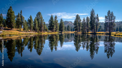Trees Are Reflected In The Still Water Of A Lake On A Clear, Sunny Day With A Blue Sky