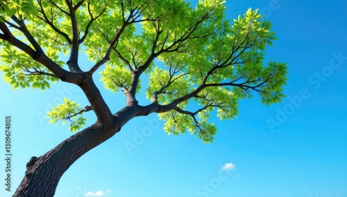 Tree's twisted branches stretch towards clear blue sky, branches, sky, peaceful
