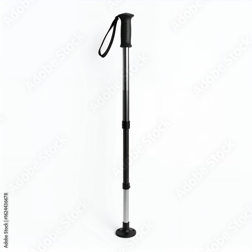 Trekking pole with black handle and silver shaft for hiking and outdoor activities on white background