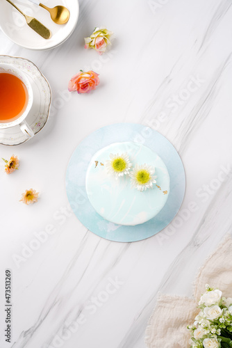 Trendy mousse cake with mirror glaze decorated. Modern european desserts at white marmer stone background.