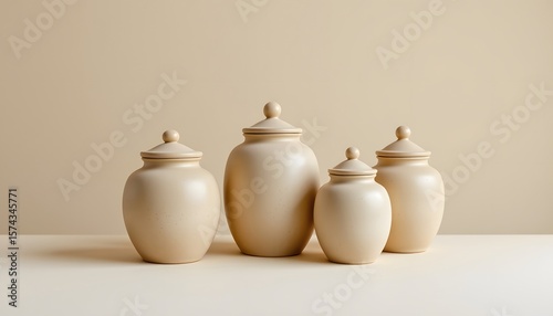 trio of sand colored ceramic jars on plain light backdrop, balanced composition