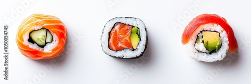 Trio sushi rolls top view pure white background salmon tuna avocado cucumber