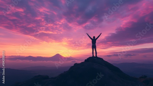 Triumphant Silhouette: A lone figure stands on a mountain peak, arms raised in victory as the sun sets behind them, casting a breathtaking, colorful sky.