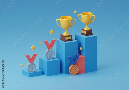 Trophies and medals on blue podiums with stars floating around on a blue background scene