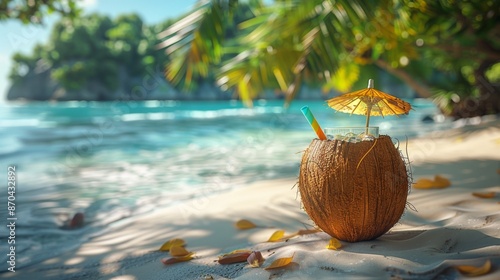 Tropical Beach Cocktail in Coconut Shell on Sandy Shore - Generative AI
