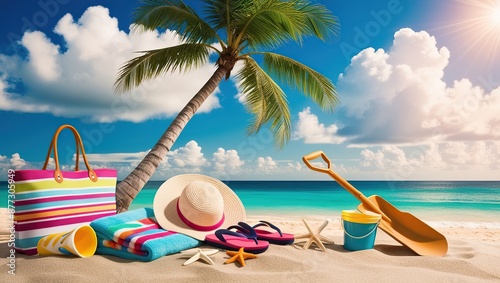 Tropical beach paradise with palm trees swaying in the summer breeze