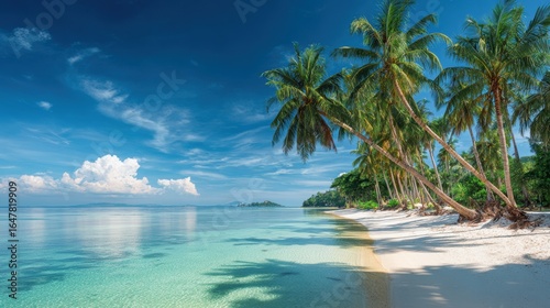 Tropical beach scene with palm trees, white sand, and blue sky in a serene coastal landscape for summer vacation getaway.
