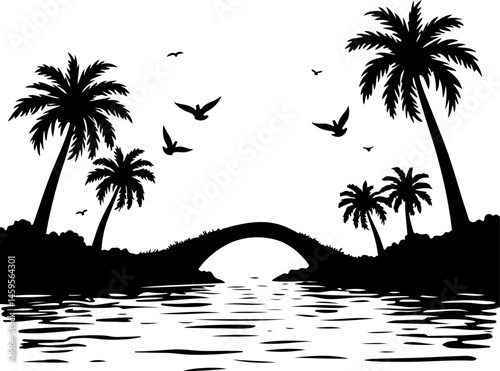 Tropical Beach Silhouette with Palm Trees and Sun"