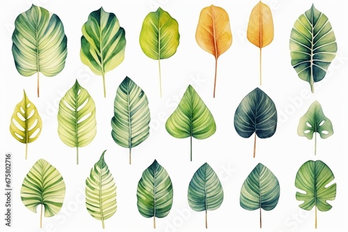Tropical Botanical Elegance: Watercolor Plant Leaves Set on White Background