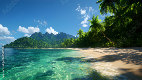 Tropical Island Beach Scene with Lush Palm Trees
