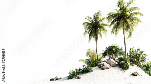 Tropical island paradise featu palm trees, lush vegetation, and smooth sandy beach under the bright, clear sky provides a serene, isolated getaway experience.