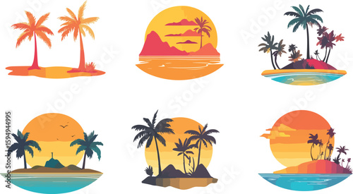Tropical Island Silhouette Set with Palm Trees and Sunset Vector Illustration