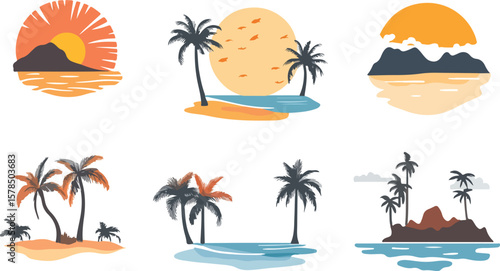 Tropical Island Vector Set with Palm Trees and Sunset Illustrations