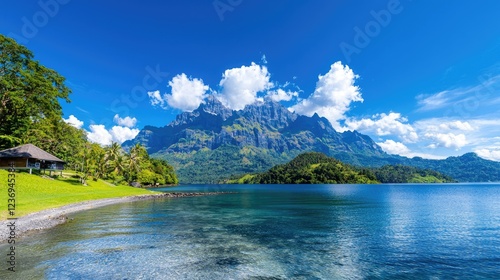 Tropical lagoon, mountain view, hut, clear water, sunny day, travel postcard