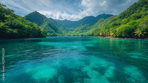 Tropical lagoon with turquoise water surrounded by mountains and lush vegetation