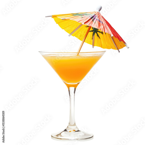 Tropical Orange Cocktail in Martini Glass with Colorful Umbrella Isolated