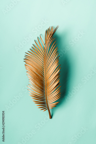 Tropical palm leaf painted with gold paint on delicate pastel mint background. Minimal art Concept