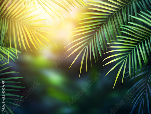 Tropical palm leaves frame a bright sunlit background, creating a lush and vibrant scene.